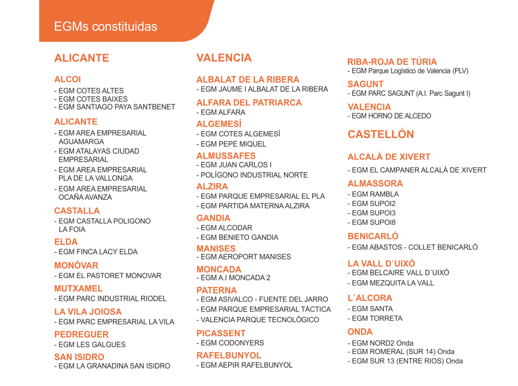 Alicante ya cuenta con cuatro EGMs constituidas —Atalayas Ciudad Empresarial, Pla de la Vallonga, Aguamarga y Ocaña Avanza— que han demostrado su utilidad como interlocutores válidos y efectivos en la mejora y modernización de las áreas industriales. Estos ejemplos son la mejor garantía del impacto positivo que puede tener la futura EGM DISTRITO EMPRESARIAL.